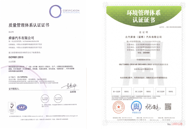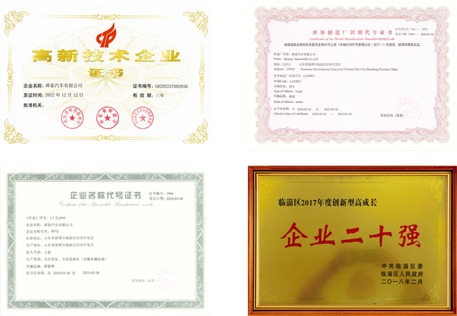 舜泰汽车先后被评为临淄区“双二十强”企业、省专精特新企业,拥有质量管理体系认证、环境体系认证、职业健康安全管理体系、认证世界制造厂识别代号证书 、企业名称代号证书、及各类专利50多项......